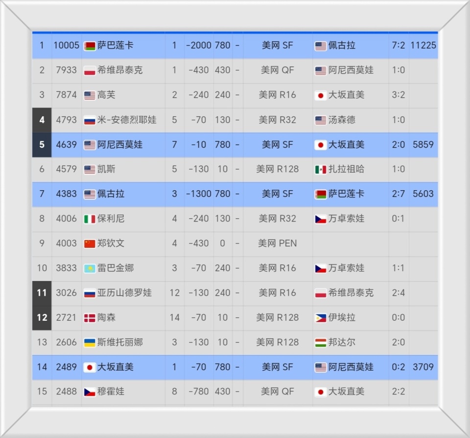 重返美网4强之后,大阪直美的即时排名已经来到第14位,距离中国一姐郑钦文仅有5个名次的差距。