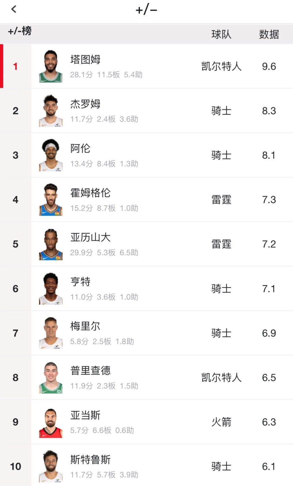 今年季后赛,塔图姆场均28.1分11.5篮板5.4助攻2.1抢断0.8盖帽3.3失误,三项命中率:42.3%,37.2%,88.9%。场均得分联盟第7,篮板联盟第5,抢断联盟第2。场均命中3.6记三分,联盟第4。场均正负值+9.6,高居联盟第1!